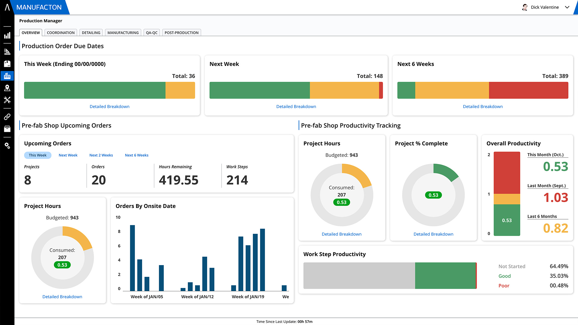 Comprehensive, data-driven pre-fab production management from manufacturing to shipping and installation. Office, shop, and site managers track progress, monitor issues, and generate productivity reports.